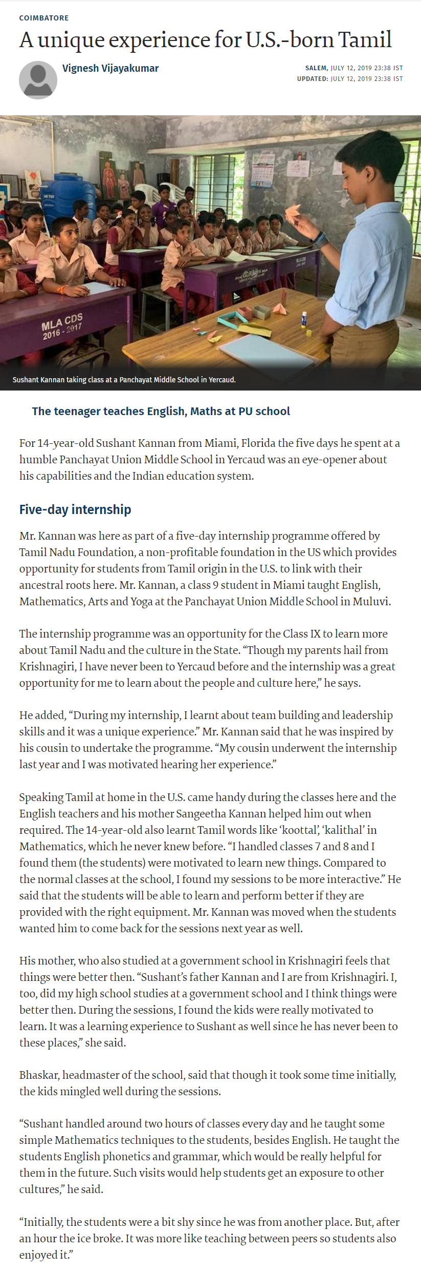 TV coverage of New Jersey Tamil youth, her amma and friends as they volunteer in Vedaraniam, Tanjore district, through TNF’s Service and Education Internships. Congratulations to the moms and youth for volunteering in remote parts of Tamil Nadu!